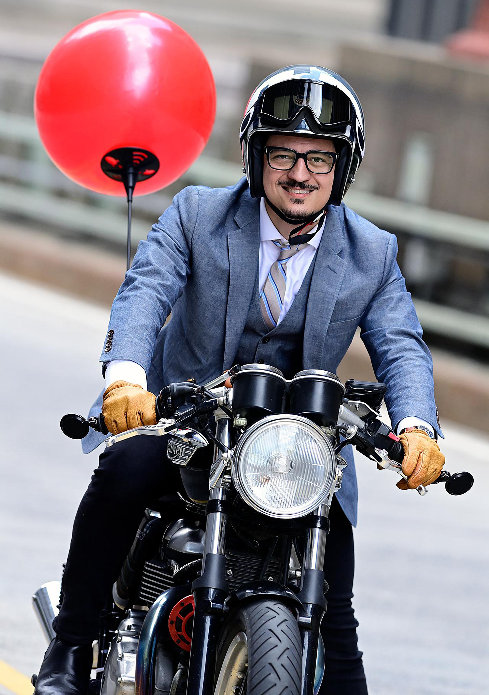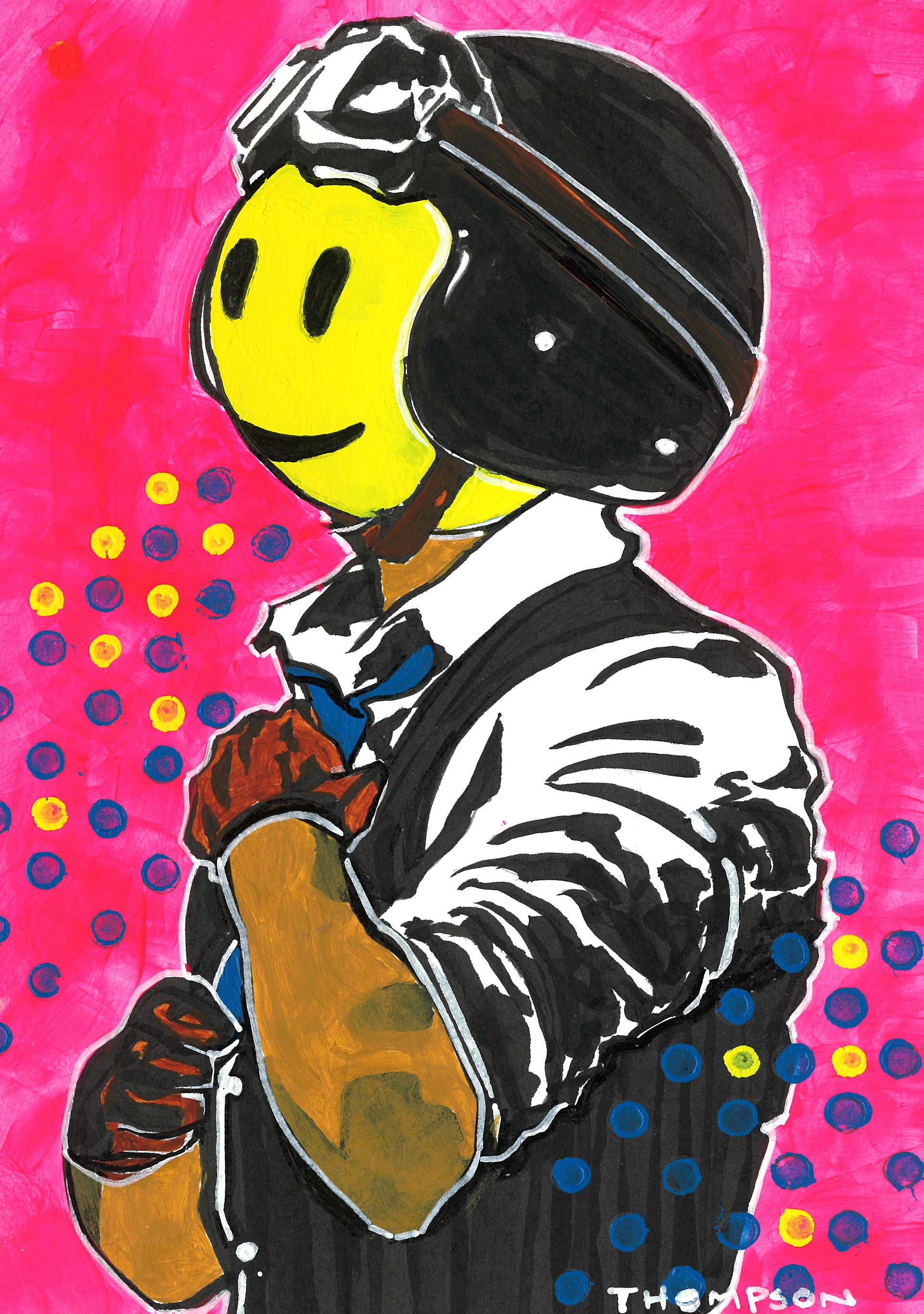"Facing serious issues with a playful attitude is a longstanding theme in my work. Back in 2016, I was playing with ideas for motorcycle themed artwork, and working on some 'Inktober' prompts to explore ideas. Using a photo I’d seen from the 2015 DGR as reference, I drew a rider fastening his helmet. I had recently painted a Triumph rider with a giant smiley face head, and liked it so much that I went back to that old sketch of the dapper gentleman in his three-quarter helmet, adding bright colors and a big smiley face. I like to think it represents how the Distinguished Gentleman's Ride demonstrates how positivity and joy can inspire meaningful action… and also, art.”