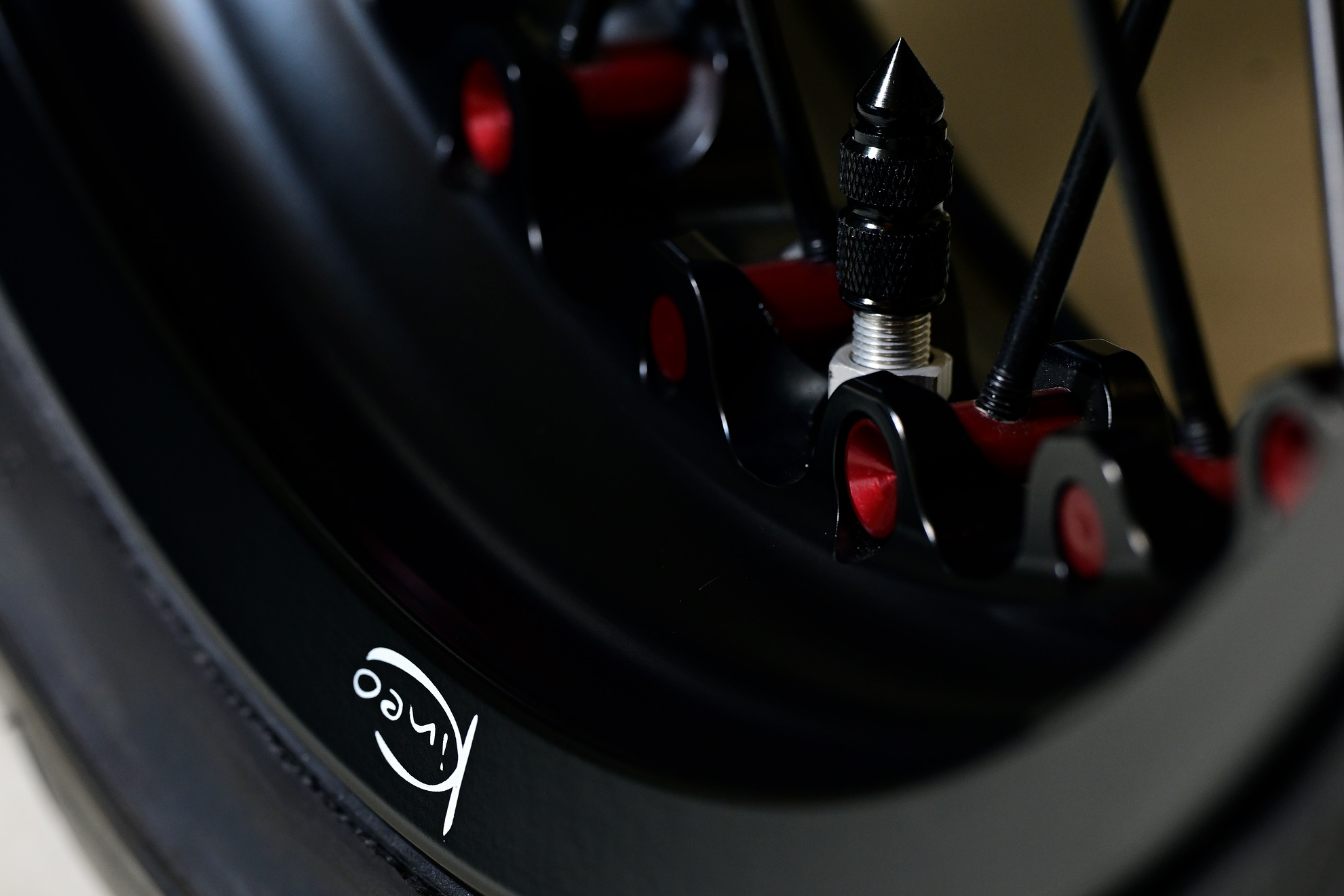 Everything is cyclical in this life … and so we return to those Kineo rims … satin black with red accents, sporting road / race hybrid Avon tires. In our opinion, these are the nicest aftermarket rims you can buy, Italian made, with a manufacturing timeline of 8 to 10 weeks.