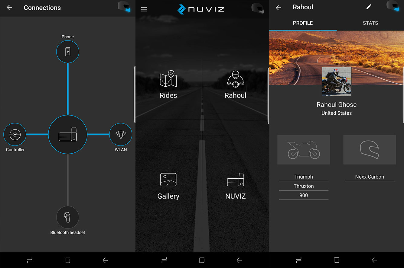 The NUVIZ app is sleek as well, allowing you to connect your devices … phone, controller, Bluetooth headsets … set up a personal profile (location, bike, helmet used), monitor battery levels, download maps based on your area to the required microSD card, view your recorded videos and stills, and even set up directions for specific rides, which are presented during your trip via turn by turn directions with time and distance-to-destination information displayed.