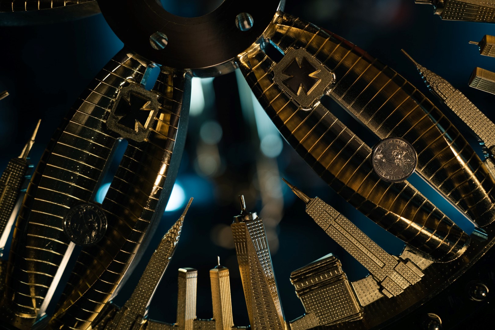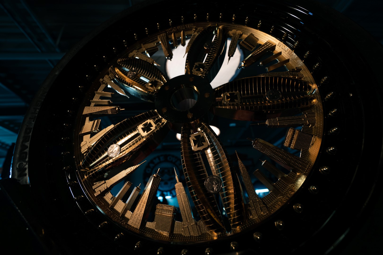 On the wheels, the Manhattan buildings are engraved in metal with such precision, even individual windows are visible, Bienkiewicz says.